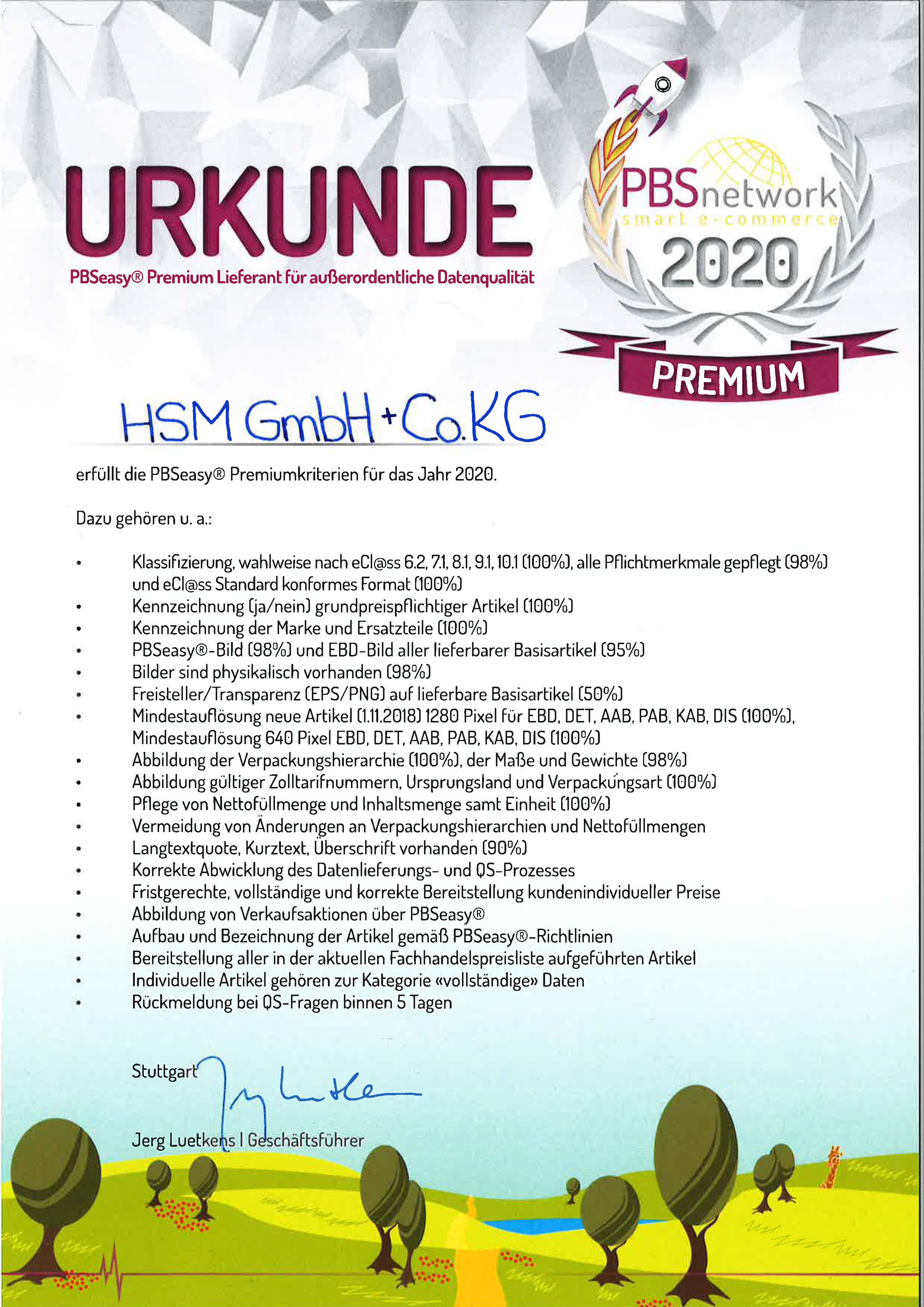 Im Rahmen des jährlich stattfindenden Lieferantenworkshops, wurde der süddeutsche Aktenvernichter-Hersteller HSM GmbH + Co. KG von der PBS Network im November erneut als „PBSeasy® Premium Lieferant für außerordentliche Datenqualität 2020“ ausgezeichnet.