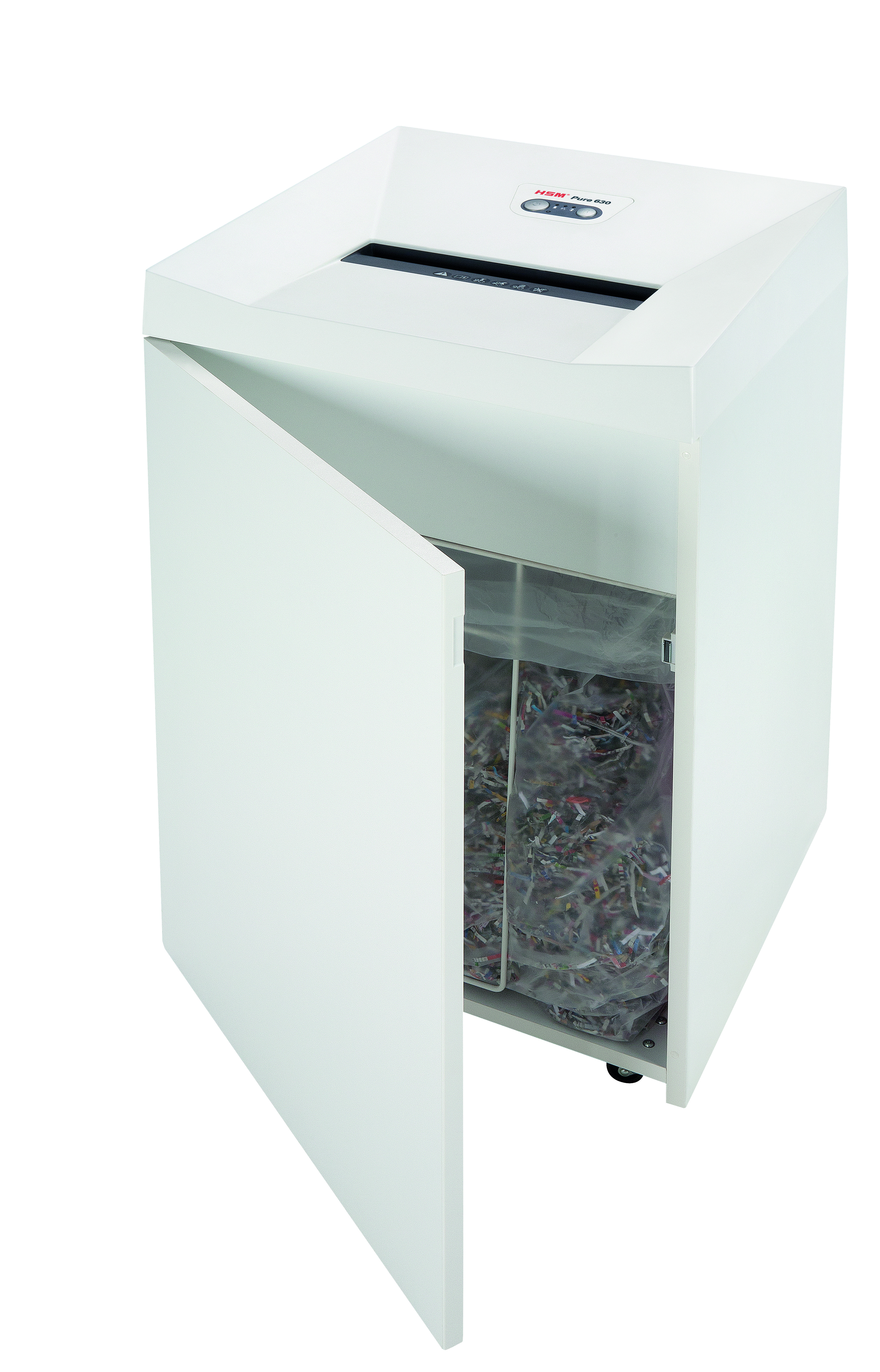 Der Aktenvernichter mit robustem Holzunterschrank hat eine breite Tür mit extra weitem Öffnungswinkel.