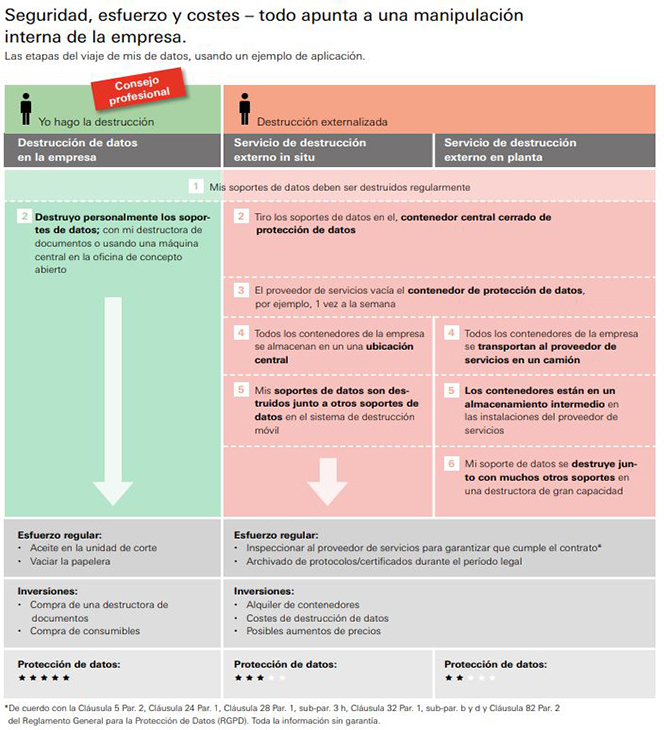Además, a menudo se subestiman el esfuerzo y los costes que conlleva la destrucción externa de documentos, en comparación con una destrucción interna de documentos.