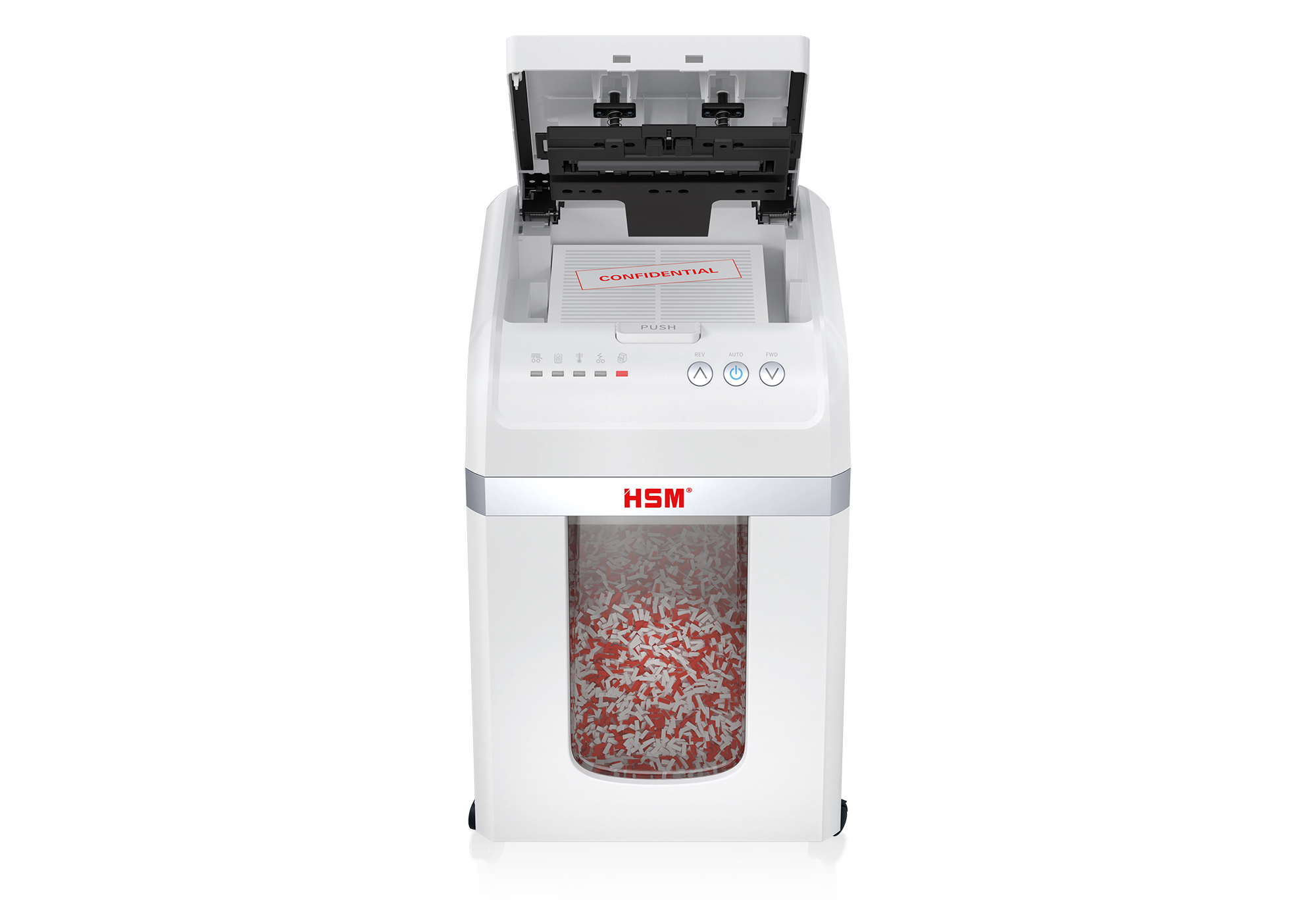 Il distruggidocumenti completamente automatico ti offre una sicurezza dei dati senza sforzo. Basta inserire la pila di carta, chiudere lo sportello superiore e la macchina fa il resto. Il distruggidocumenti Autofeed distrugge fino a 200 fogli in particelle con livello di sicurezza P-4 (4x12 mm), garantendo così la sicurezza dei dati conforme al GDPR.